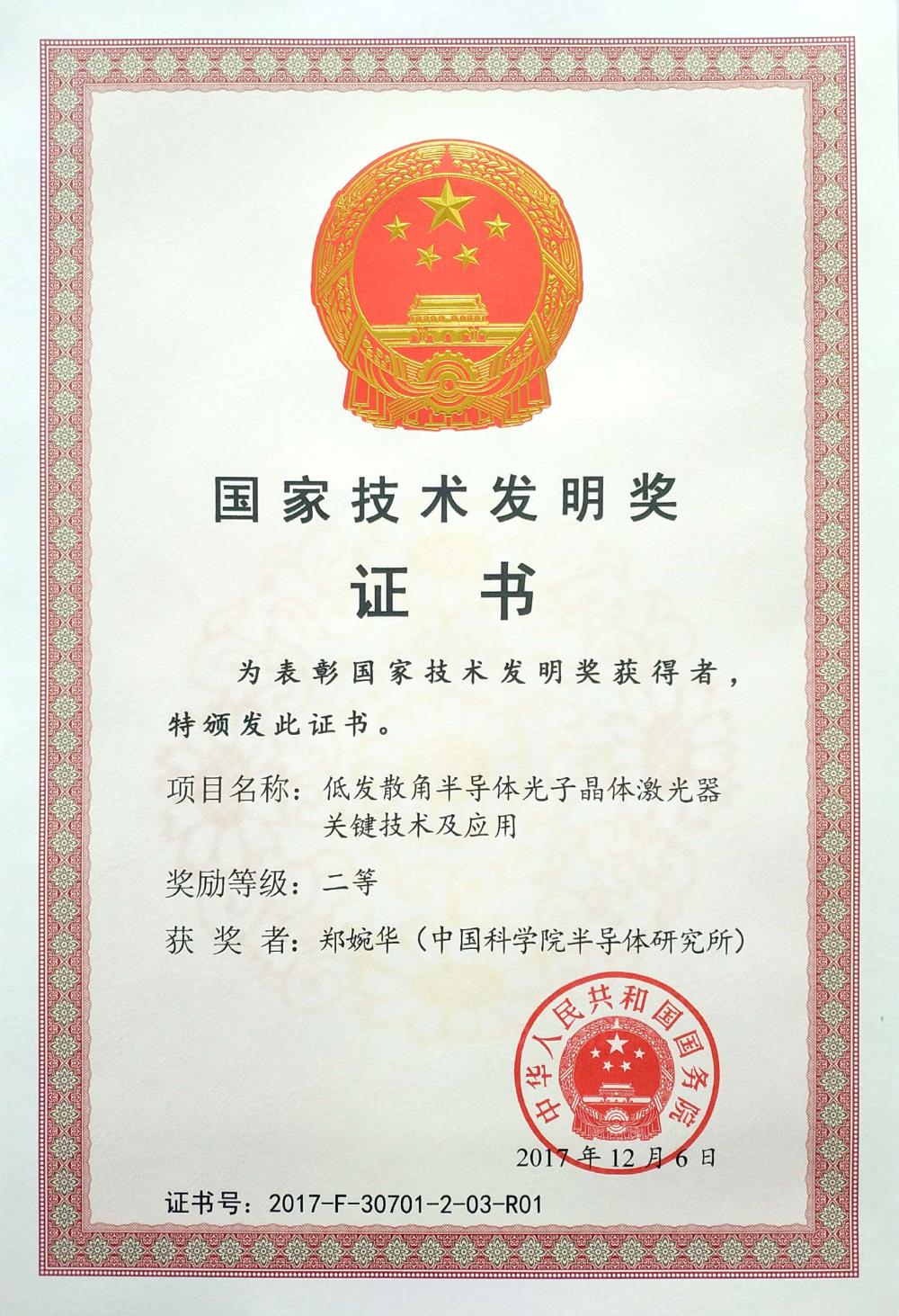 郑婉华研究员课题组 “低发散角半导体光子晶体激光器关键技术及应用” 项目荣获2017年国家技术发明奖二等奖。项目主要完成人:郑婉华、渠红伟、王宇飞、马长勤、王海玲、刘安金。该项目通过在现有半导体激光器外延材料和器件结构中引入光子晶体结构,攻克了半导体光子晶体激光器的理论模拟方法、结构设计、外延材料生长、工艺制备和封装测试等一系列自主关键技术,实现了电子能带与光子模场的联合调控,在保持激光率输出的同时,输出光束的方向和模式得到极大改善,可不经整形直接使用,使光学系统大为简化。项目发表SCI论文80篇、软件著作权3项。
